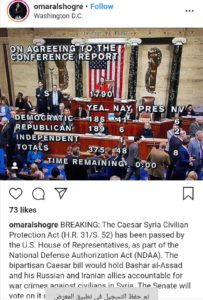 صدق مجلس النواب الأمريكي الأربعاء، على مشروع قانون ميزانية الدفاع لعام 2020 (NDAA)، الذي تَضمن أيضاً مشروع “قانون سيزر لحماية المدنيين في سوريا”، بعد حصوله على تأييد 375 نائباً من الحزبين واعتراض 48 نائباً فقط.