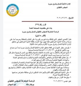 فرضت “الإدارة الذاتية” شمال شرق سوريا، حظراً للتجوال في جميع مناطق سيطرتها اعتباراً من 23 من آذار الجاري في ظل مخاوف من انتشار فيروس كورونا في المنطقة.