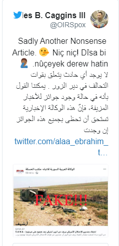 ونفى المتحدث باسم التحالف، الكولونيل مايلز كاغينز، عبر حسابه في “تويتر”، اليوم، خبر وكالة “سانا”.
