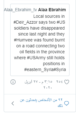 ونشرت “سانا” اليوم، الاثنين 27 من نيسان، خبرًا يتحدث عن تعرض جنديين من قوات القوات الأمريكية لهجوم بريف دير الزور الشرقي، في أثناء توجههما إلى قاعدة حقل “العمر” النفطي.