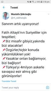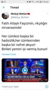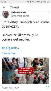 تفاعل الشعب التركي بشكلٍ لافتٍ على منصة تويتر مع وسم suriyeli، إضافةً إلى #fatihaltaylı اسم مقدم البرامج التركي، نتيجة لكلامه عن السوريين في برنامجه “تيكة تيك” على قناة هابر تورك، مساء أمسٍ، وقد رصده المركز الصحفي.