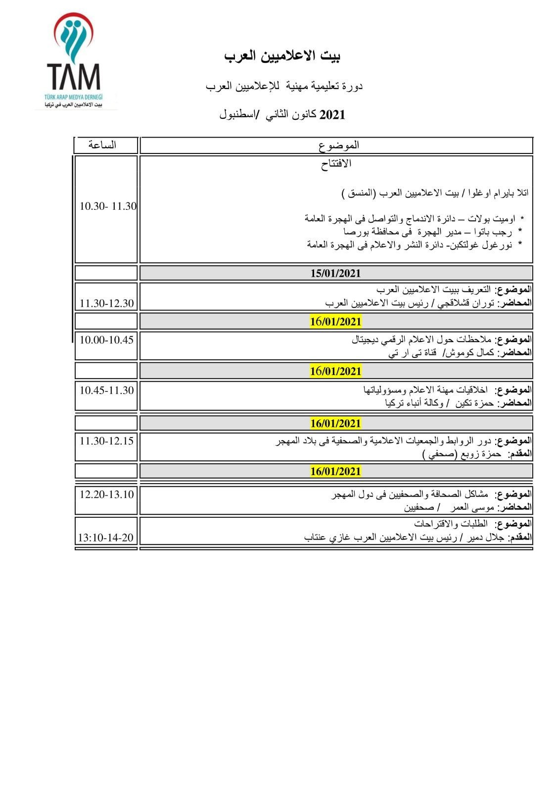 انطلقت اليوم الجمعة 15 كانون الثاني/يناير، فعاليات الدورة المهنية التدريبية لجمعية بيت الإعلاميين العرب، بمشاركة عدد من الإعلاميين العرب والأتراك.
