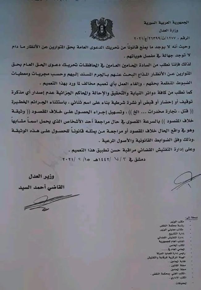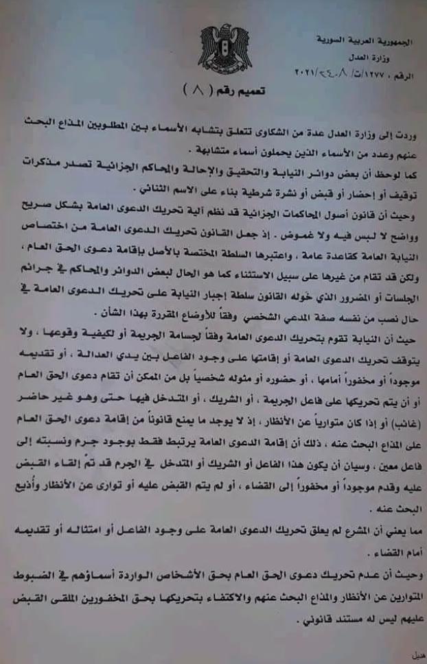 بحسب التعميم الذي أصدره وزير العدل في حكومة النظام “أحمد السيد” منع إصدار مذكرات قبضٍ أو نشراتٍ شرطيةٍ استناداً للاسم الثنائي، باستثناء الجرائم الخطيرة كالقتل والاتجار بالمخدرات.