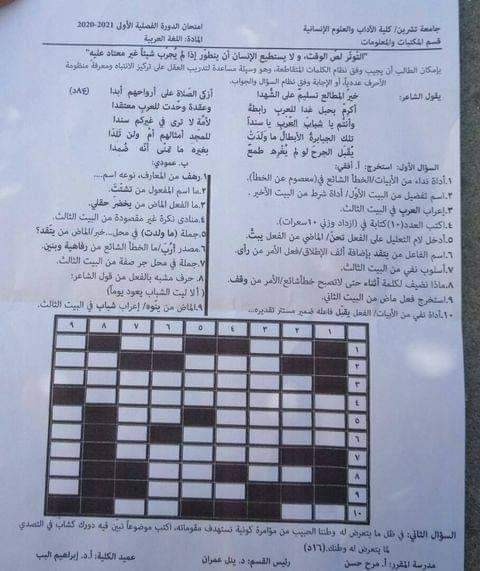 تداولت مواقع التواصل الاجتماعي اليوم الخميس 25 شباط/فبراير، صوراً لنموذج اسئلة امتحان مادة اللغة العربية بجامعة تشرين في اللاذقية.